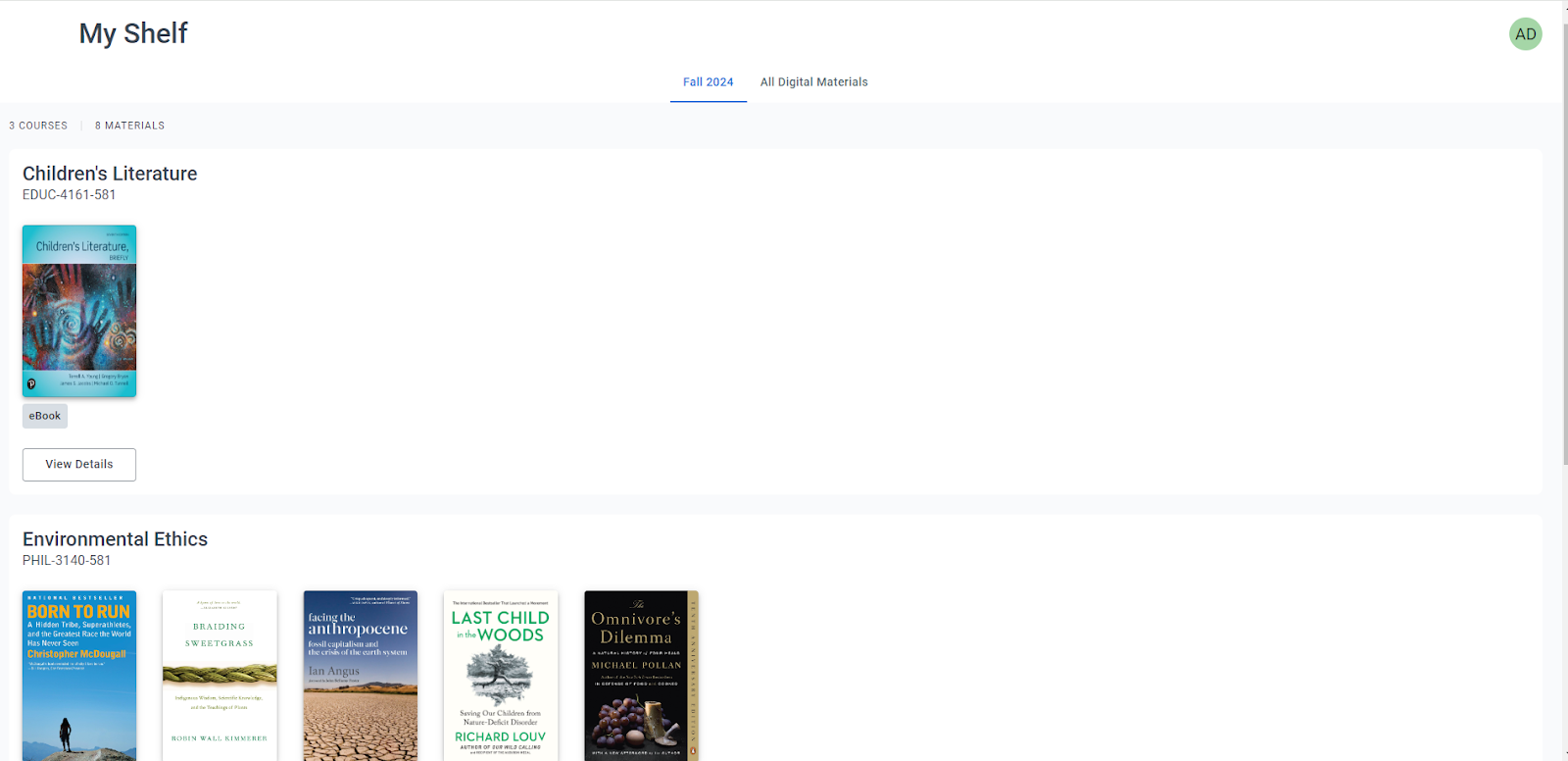 By clicking the digital materials shelf tab, you will be directed to your My Shelf page where you can see a list of all registered courses with adopted course materials: