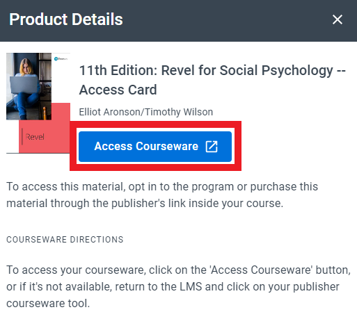 If your material has a "Access Courseware" button, simply click "Access Courseware" and you will be routed directly to the appropriate publisher's website to access the content: